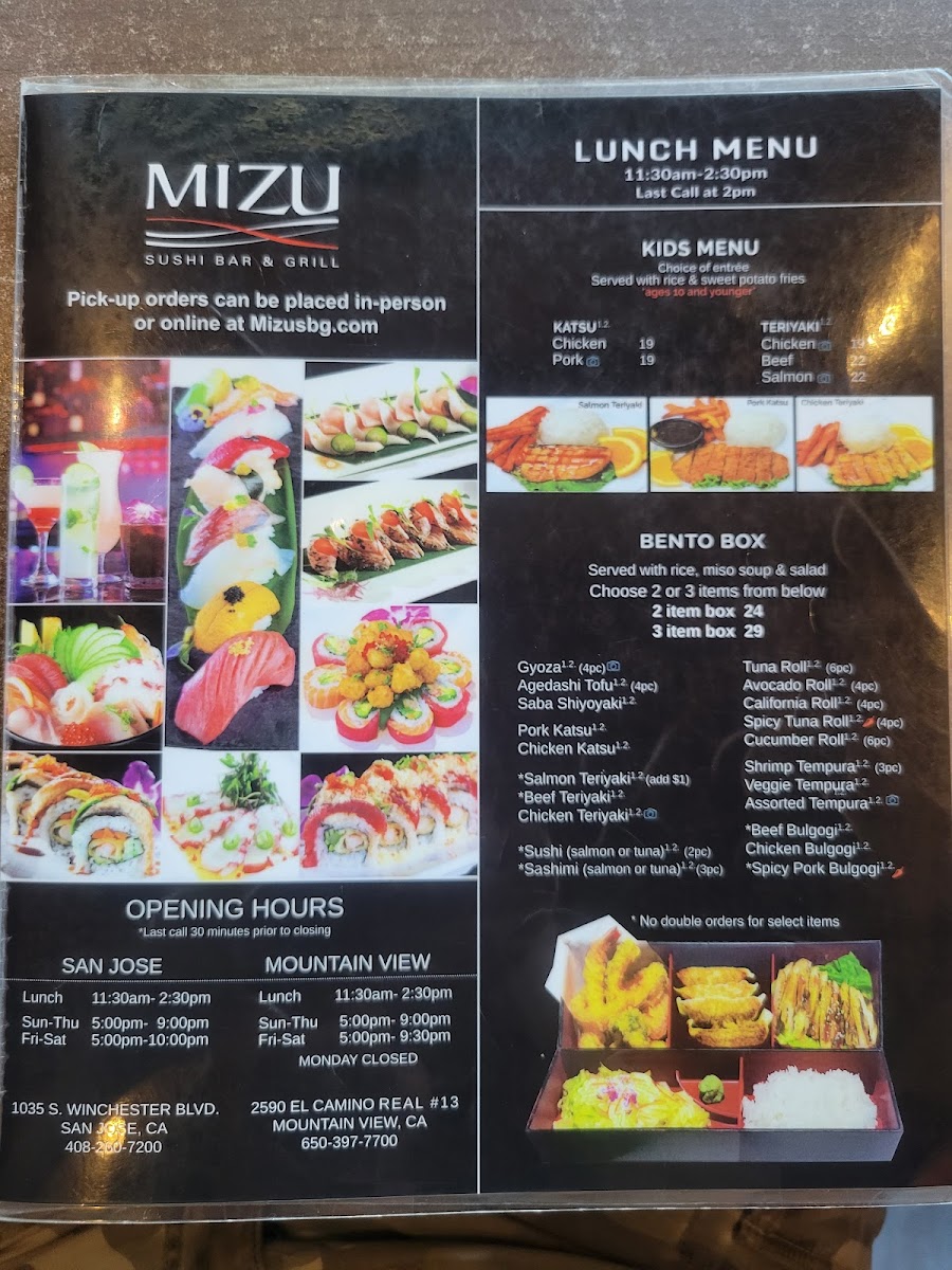 Introducing the menu at Mizu Sushi Bar & Grill, where the vibrant flavors of Japanese cuisine come to life! Nestled in Mountain View, this sushi haven offers a mesmerizing array of dishes. The lunch Bento Box is a standout, allowing patrons to savor two of many enticing options, from tender Pork Katsu to fresh California Rolls, all accompanied by rice, miso soup, and a refreshing salad.